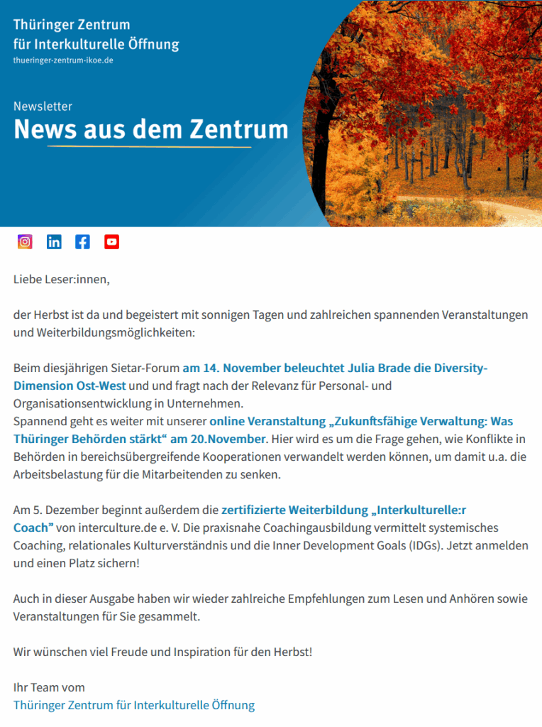 In unserem Newsletter „News aus dem Zentrum“ informieren wir regelmäßig zu aktuellen Studien und Erkenntnissen und geben spannende Lesetipps sowie Weiterbildungs- und Veranstaltungsangebote rund um das Thema Interkulturelle Öffnung und Diversitymanagement.